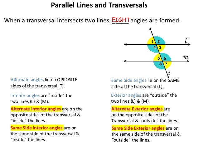 Same Side Exterior Angles : Parallel Lines A Transversal And The Angles Formed Corresponding Alternate Exterior Same Side Interior, When the lines are parallel, the measures are equal.