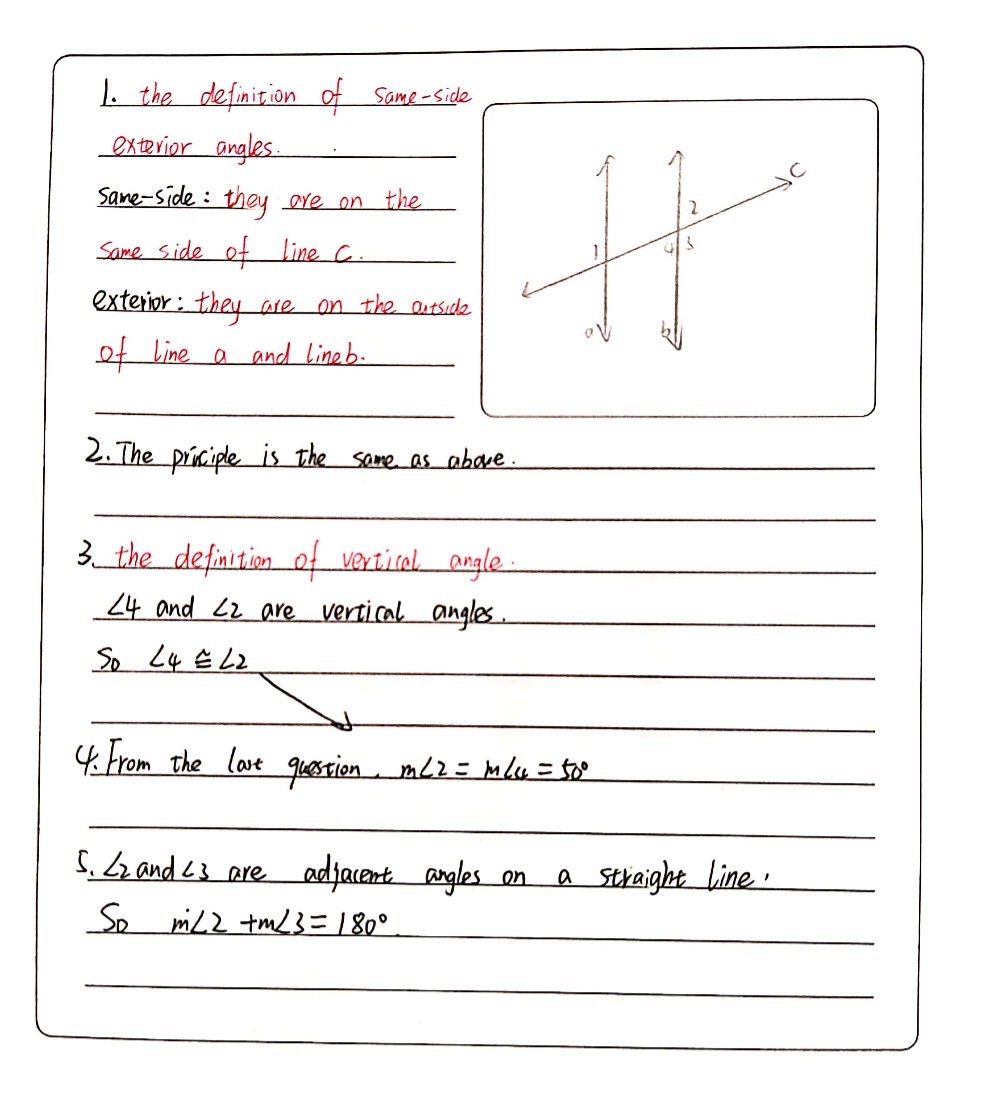 Since alternate interior and alternate exterior angles are congruent and since linear pairs of angles are supplementary, same side angles are supplementary.